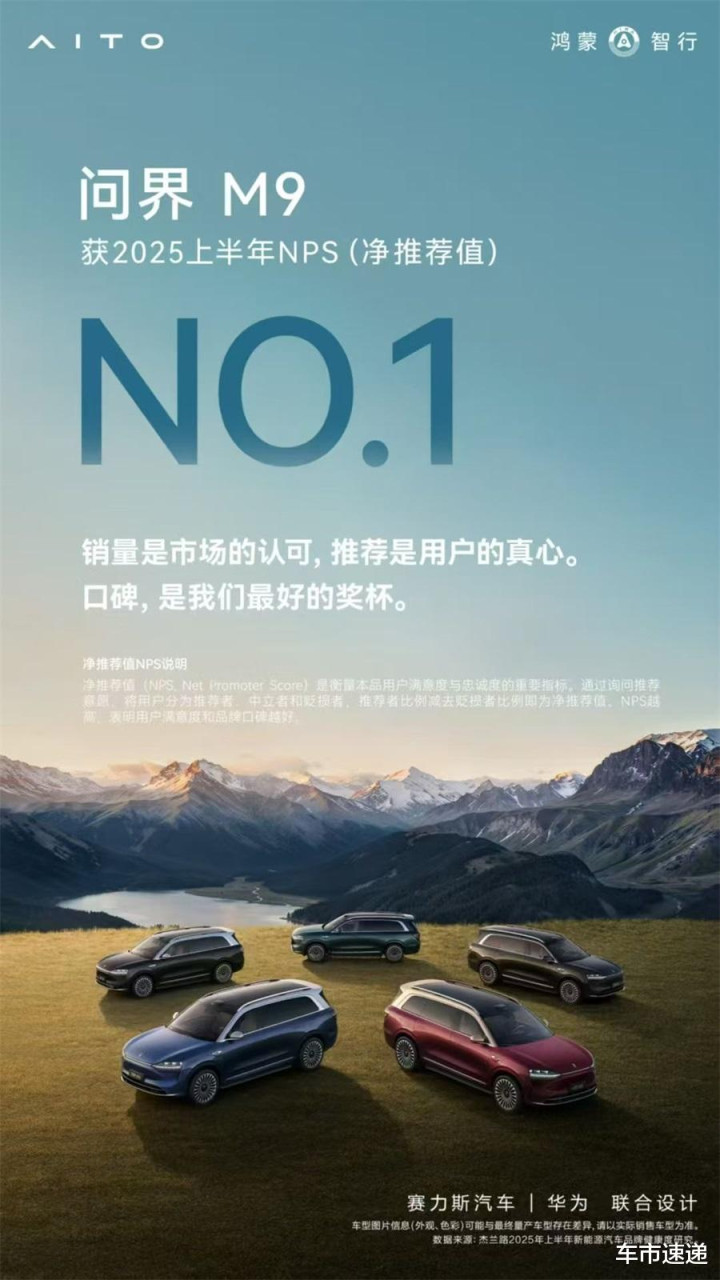 而杰兰路《2025年度上半年新能源汽车品牌健康度研究》报告显示,问界M9以85.2的NPS高分,位列中大型及以上SUV车型净推荐值第一,以及车型总榜净推荐值冠军。